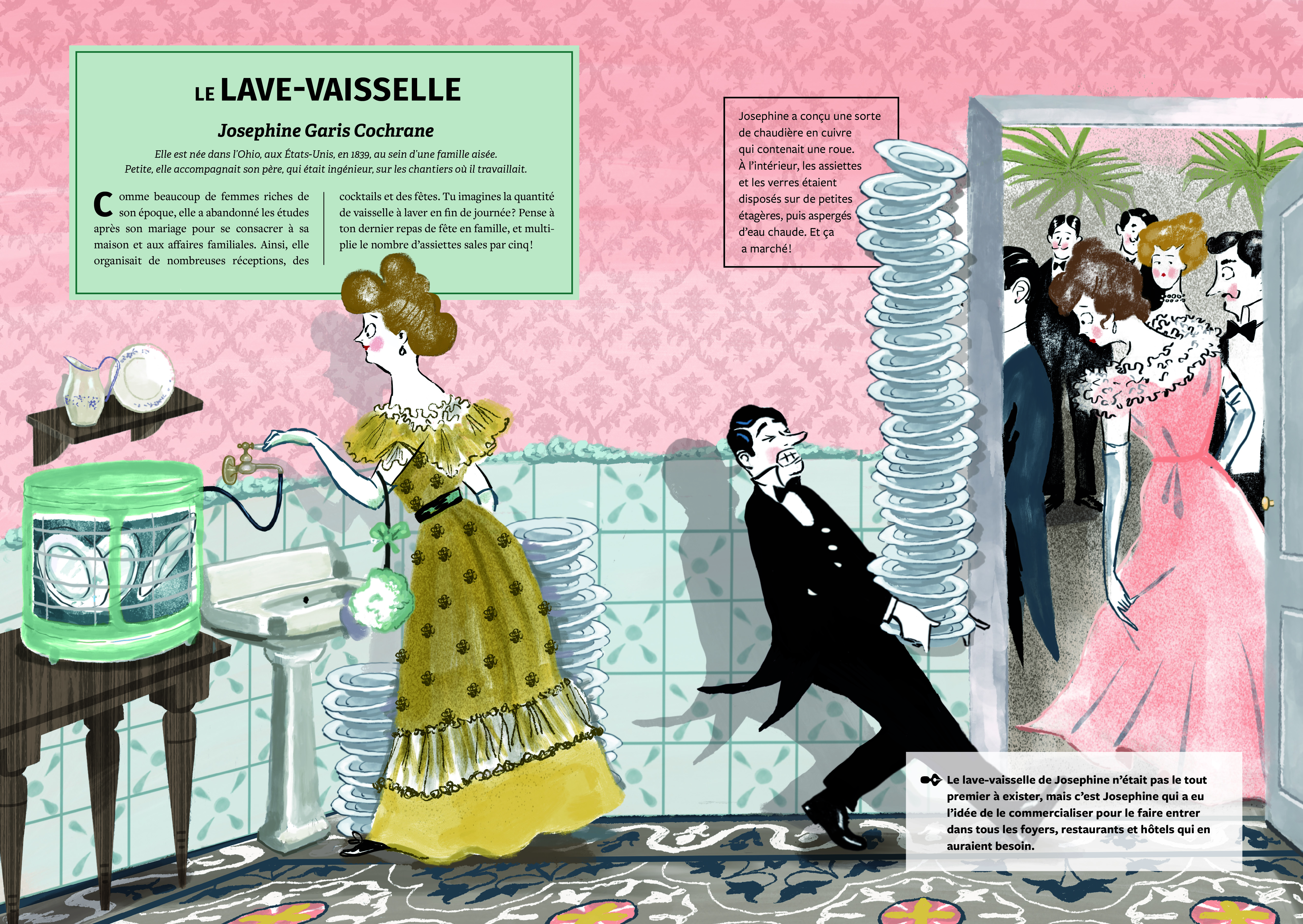 Chaque inventrice et son invention sont présentées en double page, avec un texte explicatif autour du cheminement aboutissant au résultat connu et utilisé aujourd’hui, d’une anecdote sur le parcours personnel de la créatrice et d’une illustration rigolote pleine de petits détails.
