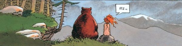 A travers une histoire simple, Sternis et Loisel s’interrogent sur notre place sur Terre et sur notre rapport à l’entité qui nous a crée et dont nous faisons tout pour nous en éloigner: la nature. Car Pyrénée incarne l’écartèlement qui se fait de plus en plus ressentir entre notre condition primitive et celle synthétique vers laquelle nous allons: en faisant évoluer leur protagoniste dans un lieux dénué d’humain et en la plaçant face à un cicérone qui a subi le joug et la cruauté de l’hominidé et qui pourtant ne conserve aucune rancune face à cette espèce, Sternis et Loisel nous soumettent l’idée que la plus sauvage des créatures sauvages démontre bien plus de sagesse que nous. Les deux auteurs énoncent en effet que la conscience et l’esprit sont peut-être bien des notions dont l’ubiquité englobe l’ensemble du règne vivant, qu’il se tienne sur ses deux jambes et possède le pouce opposable ou non.
